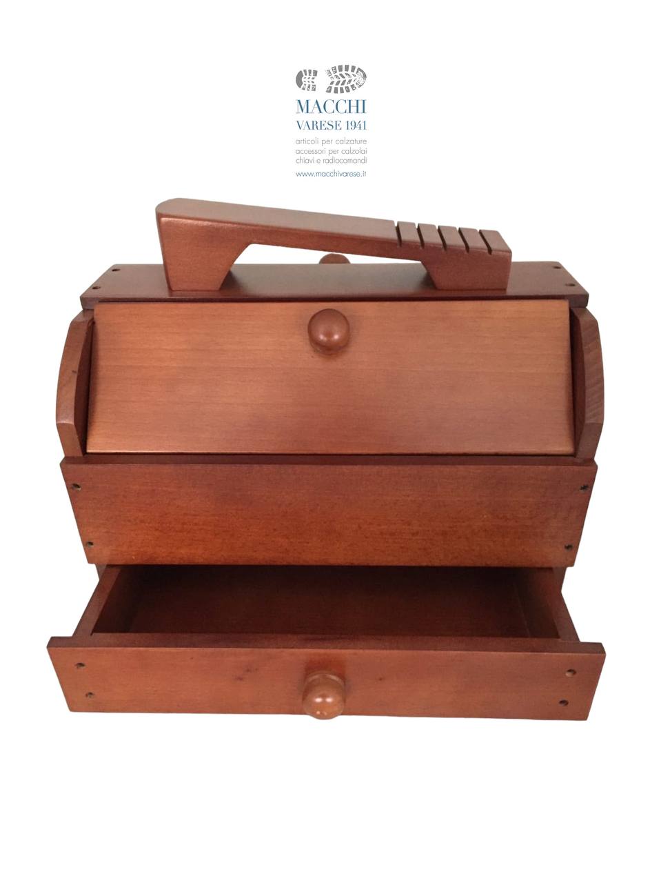 CASSETTA PORTA ACCESSORI IN LEGNO A DUE SCOMPARTI E UN CASSETTO. DISPONIBILE IN VERNICE TINTA NOCE.
