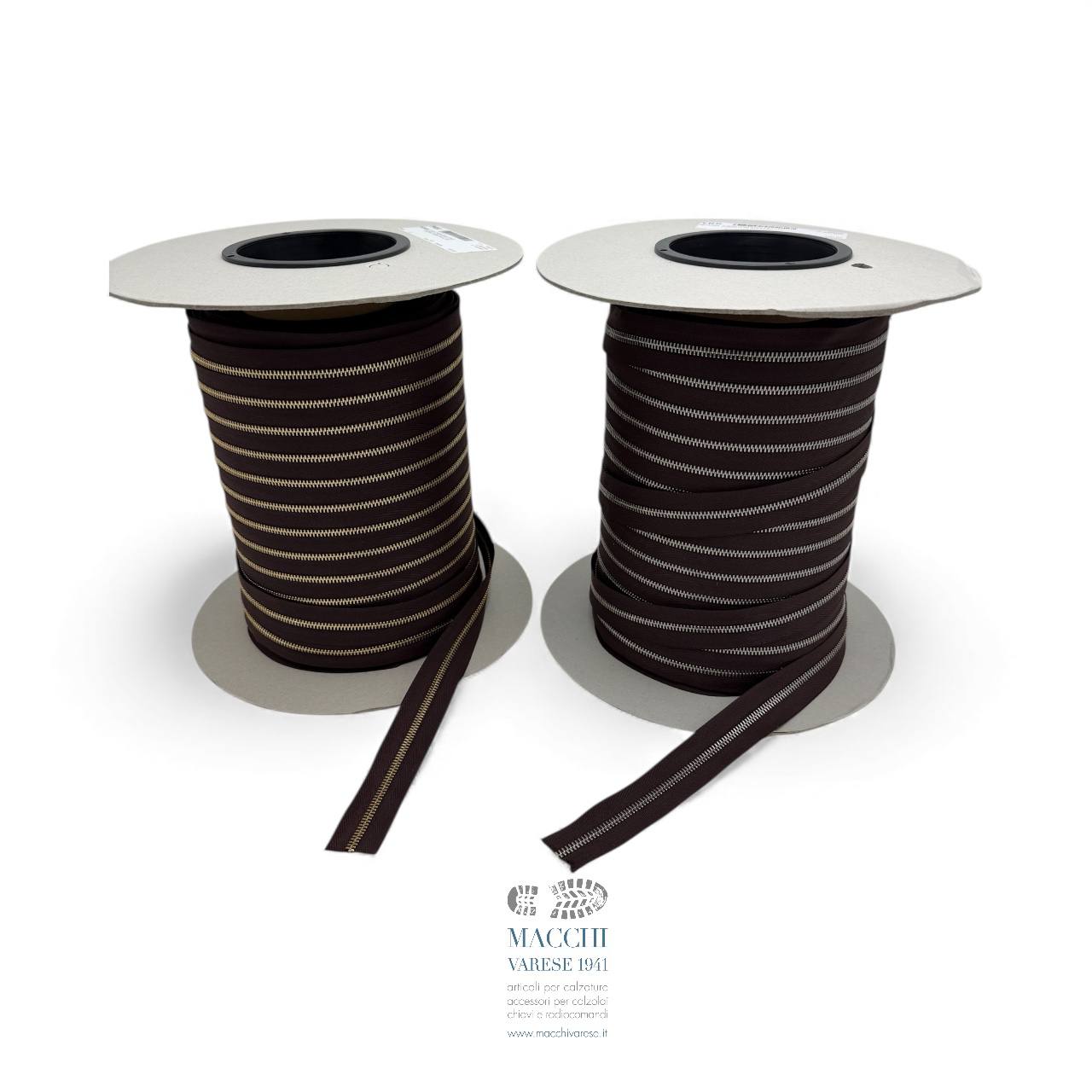 CERNIERA LAMPO IN METALLO YKK NICKEL TIPO 3. COLORE: MARRONE CON METALLO NICKEL, MARRONE CON METALLO ORO