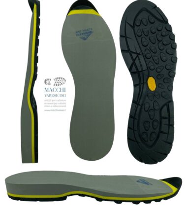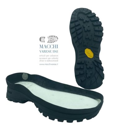 SUOLA MAC76 SESTRIERE. Suola in gomma con battistrada Vibram Ibex (megagrip) e zeppa in micro. Misure disponibili: 04-05-06-07-08-09-10-11-12-13-14 Colore disponibile: nera con zeppa grigio/gialla