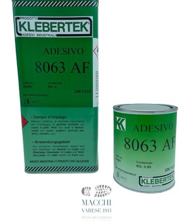 ADESIVO 8063 AF KLEBERTEK. ADESIVO POLIURETANICO A TEMPO APERTO BREVE. ELEVATA PRESA INIZIALE. PERFETTA ADESIONE SU: PVC, PLIURETANO, GOMMA VULCANIZZATA, COMMA TERMOPLASTICA (TR), GOMMA MICROPOROSA, CUOIO E PELLE, TESSUTI NATURALI E SINTETICI. CONFEZIONI DISPONIBILI: – LATTA DA 0,850 kg – LATTA DA 4kg