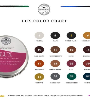 LISSAWAX PLUS E’ UNA CERA COLORANTE PER LISSE, GUARDOLI, UOLE E TACCHI. CAPACITA’ COPRENTI ECCEZIONALI. PRODOTTO SPECIFICO PER OGGETTI IN CUOIO. DONA UN’ ELEVATA FINITURA E LUCENTEZZA. FORMULATO CON CERA NATURALE DI CARNAUBA.