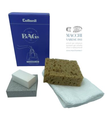 CLEANING KIT specifico per borse composto da un guanto in microfibra, una spugna pulente, una gomma per pulire il nubuk e una gomma per pulire la pelle liscia.